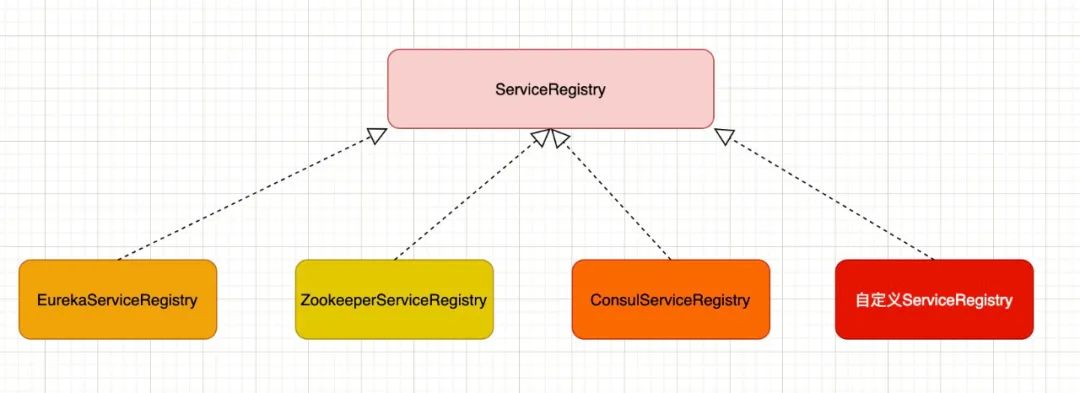 如果看其他服务发现框架对Spring Cloud进行集成时,基本上都是实现的这个接口。也就是说,ServiceRegistry是Spring Cloud提供的一个服务发现框架集成的规范。对应的框