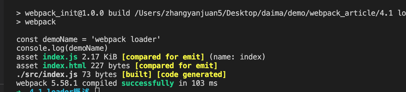 执行构建命令,在控制台可以看到 js-loader 文件的 console.log 输出了 index.js 文件内容,从上面的 简易版 js-loader.js 文件中可以看出,loader 本身就是一个函数,在该函数中对接收的内容进行转换,然后返回转换后的结果。