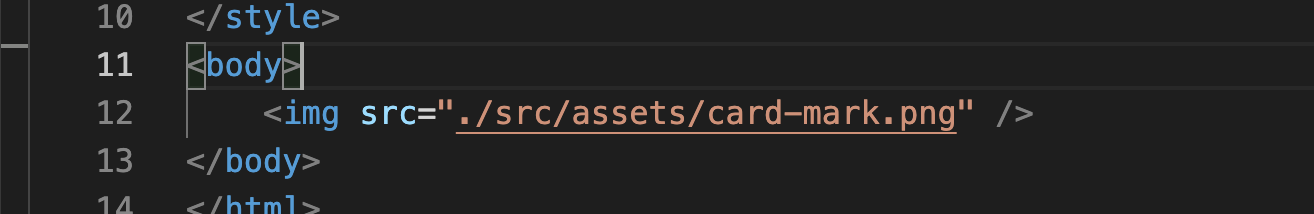 在index.html 中我们使用 img 标签展示一张图片,图片为相对路径,在 src/assets 文件夹下增加名为 card-mark.png 的图片,在浏览器直接打开 index.html 我们可以看到,图片可以正常展示。