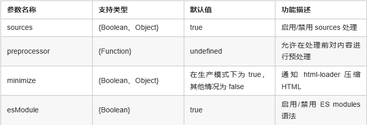 本节我们介绍了 html-loader 的使用方法和 html-loader 包含的 4 个参数 sources、preprocessor、minimize、esModule, 它们分别对应 html-loader 在项目实践中的 4 个重要功能:
