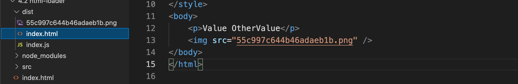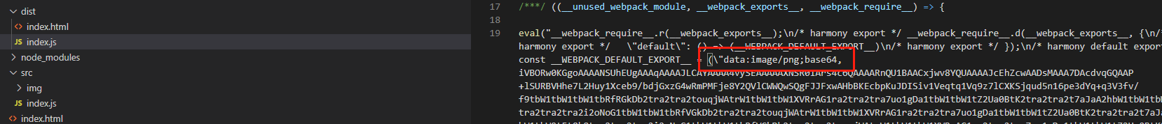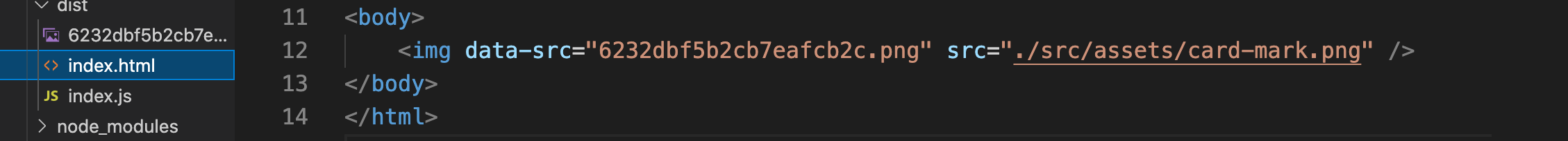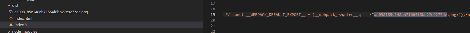 此时在执行打包命令,可以看到在 dist 文件夹下除了index.html 文件和 index.js 文件,又多了一个 扩展名为 .png 的文件,我们打开 dist 文件夹下的 index.html 发现 src 的引用地址已修改,此时在浏览器中直接打开 dist 文件夹下的 index.html 发现图片可以正常显示。