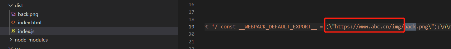 再次执行打包命令,在 dist 文件夹下输出了一个扩展名为 .png 的图片,让我们来对比下增加 limit 配置前和增加 limit 配置后 dist 文件夹和 index.js 文件的变化。