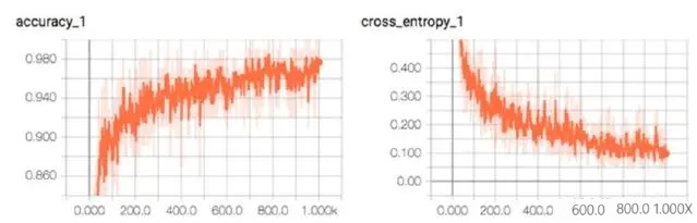 除了定期记录损失和准确率之外,我们还可以记录和绘制它们,以分析其长期趋势。下图是 TensorBoard 上展示的准确率和交叉熵损失。