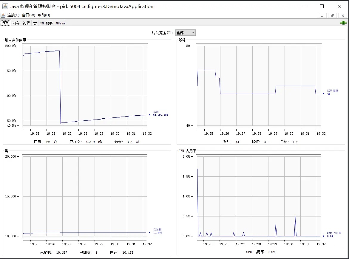 JAVA_OPTS="$JAVA_OPTS -Dcom.sun.management.jmxremote.ssl=false"使用JConsole连接了一个本地程序,在概述可以看到Java程序运行的概览信息,包括堆内存使用情况、线程、类、CPU使用情况四项信息的曲线图。